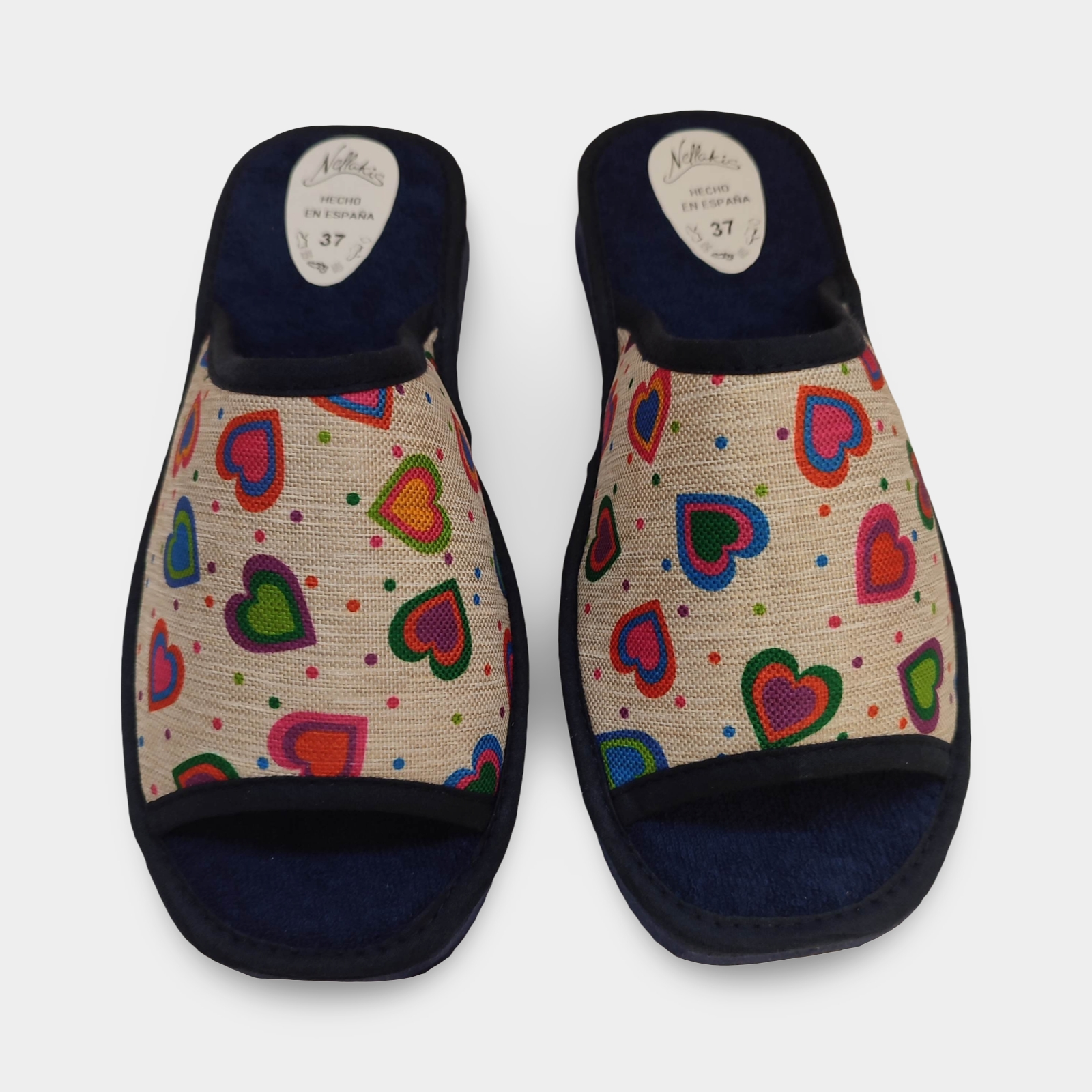 Sabatilles de casa per a estiu amb cors de colors en blau marí
