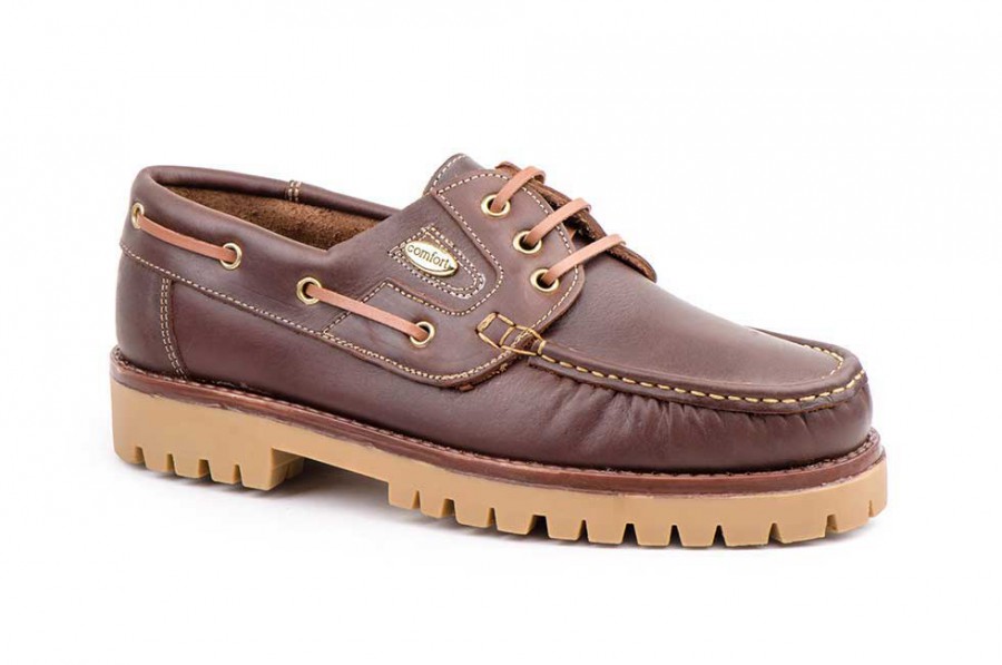 Náutico de piel de color marrón, con cordones en color cuero. Suela recia para invierno, de 2.5cm en la suela y 3.5cm en el tacón. Para aislar lo mejor posible el pie del suelo, para evitar que se coja frió.