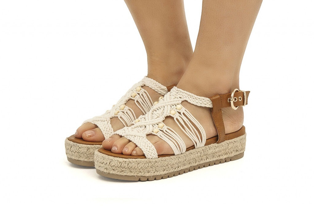 Sandalia con tiras de la marca Mustang muy bonita y elegante fabricada en yute con la parte del empeine en ganchillo.