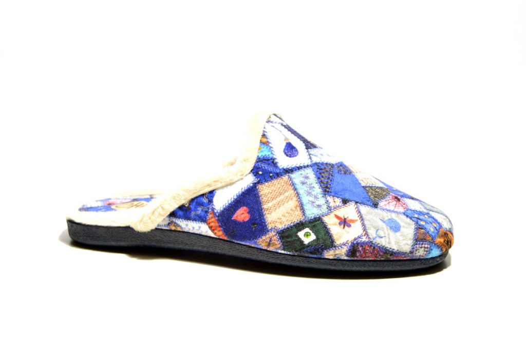 Zapatillas para casa destalonadas de chica en color azul con diferentes dibujos.
