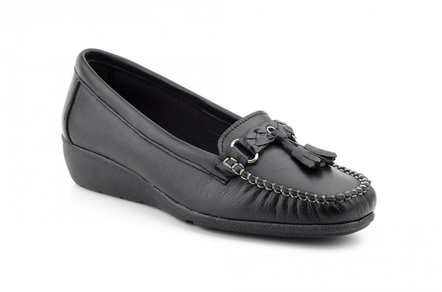 Mocasín Kiowa de mujer muy cómodo y suave. Fabrico con pieles de primera calidad. Suela de goma con cuña de 4cm. Cosido visto tipo kiowa con hilo de color claro para hacerlo mas actual. Con dos borlas en el empeine.
