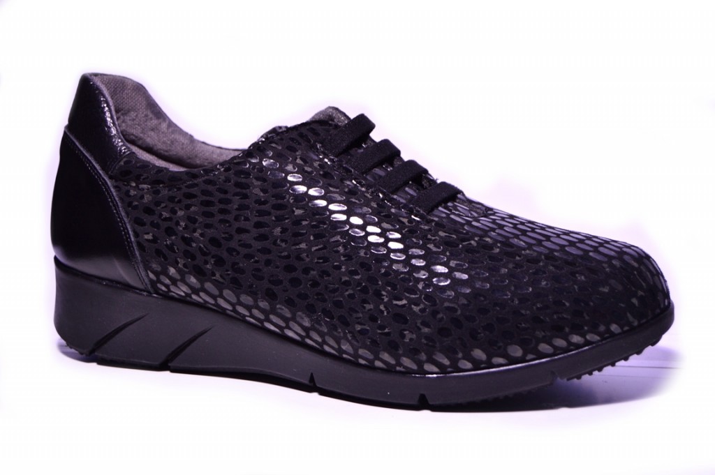 Zapato comodísimo con elásticos en el empeine, de la marca Puche, en color negro con coco.