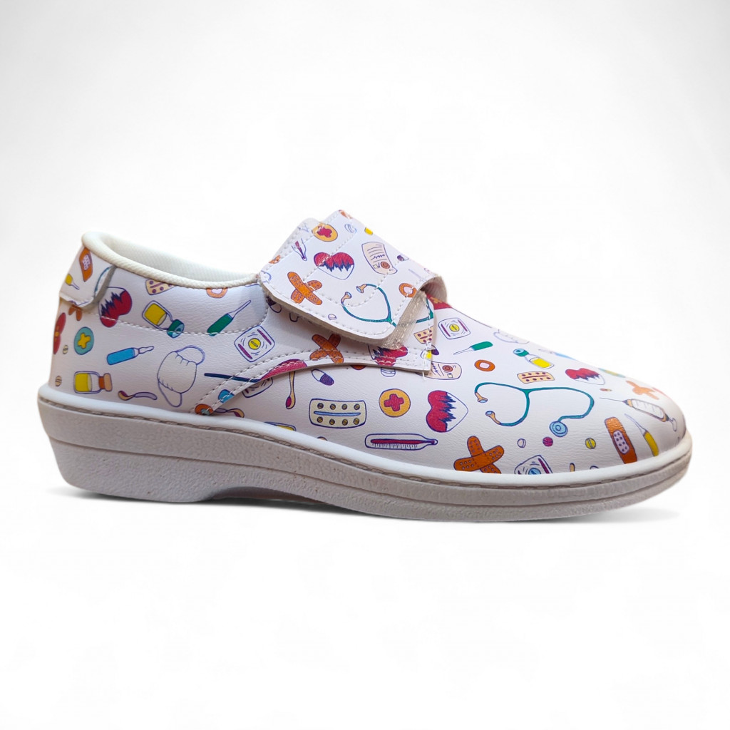 Los zuecos con dibujos para hospital o enfermería son una opción divertida y funcional para quienes pasan largas horas de pie en su trabajo. Diseñados en un clásico color blanco, estos zuecos añaden un toque de diversión y personalidad gracias a los dibujos estampados en su superficie.