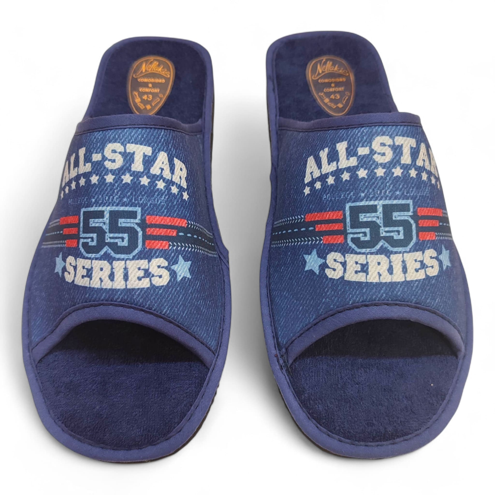 Pantoufles d'été respirantes pour hommes, en tissu éponge bleu et toile.