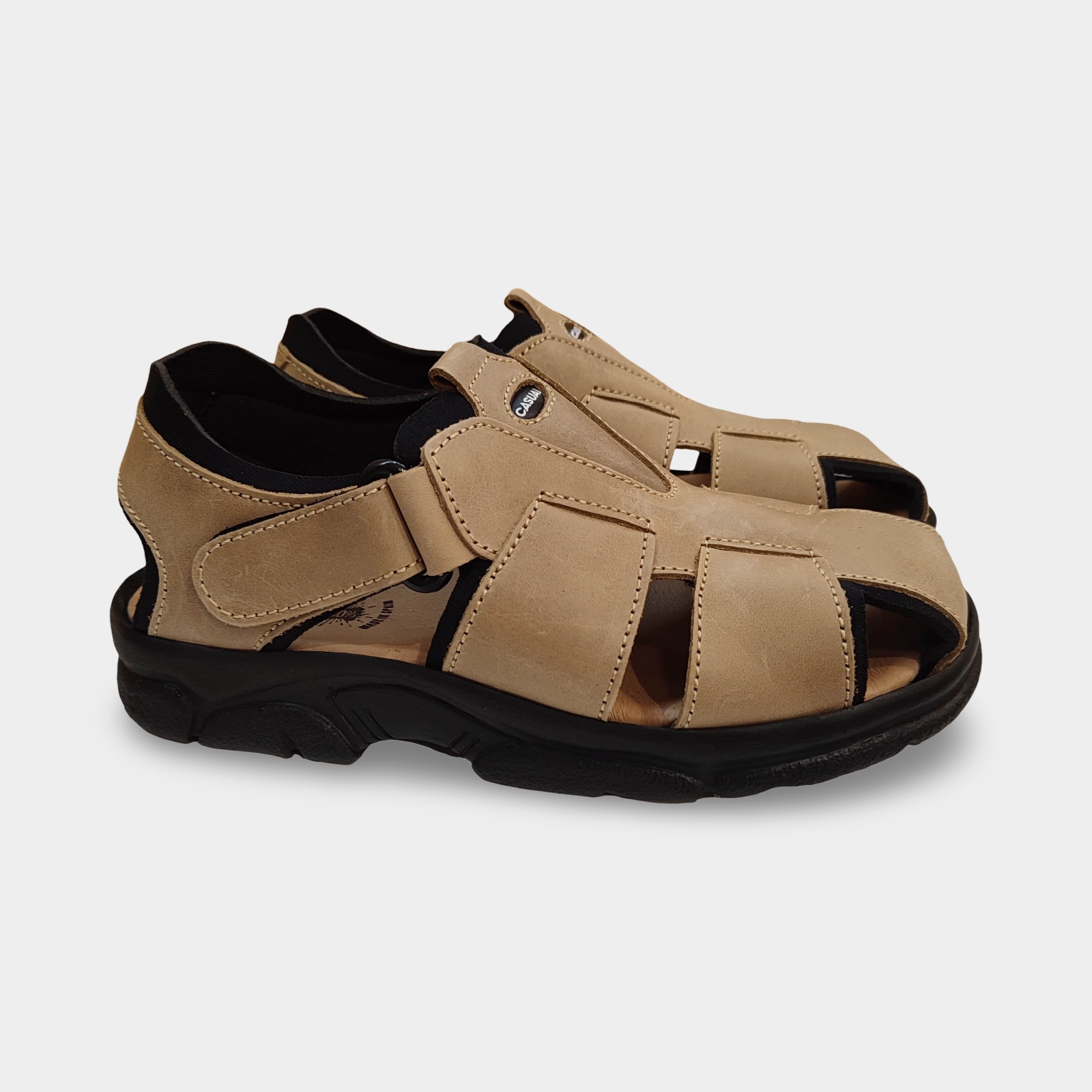 Sandálias masculinas confortáveis com acolchoamento e fecho de velcro em couro marrom claro.
