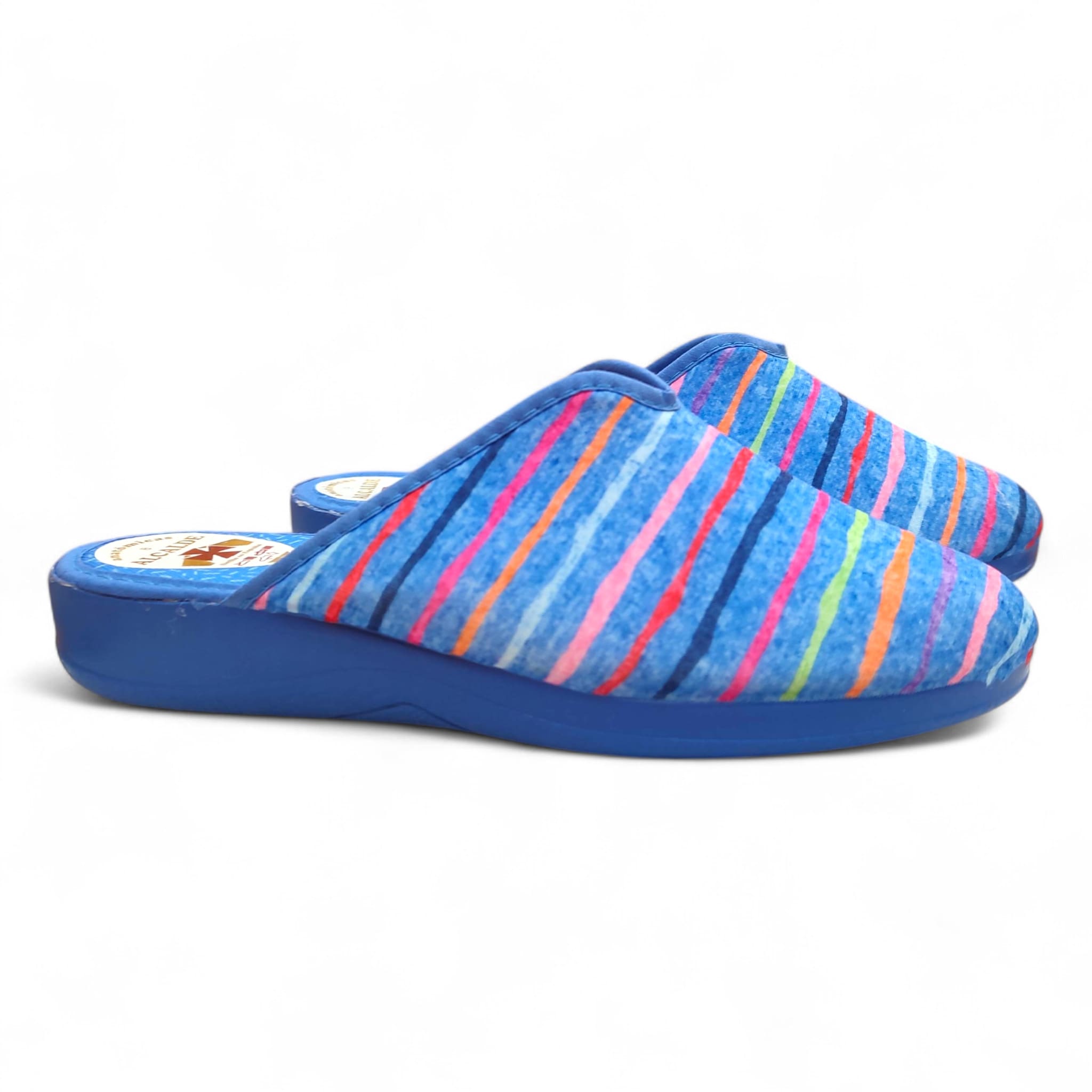 Seu design azul com linhas coloridas e alegres confere um toque veranil e casual, perfeito para quem busca um calçado prático e estiloso.