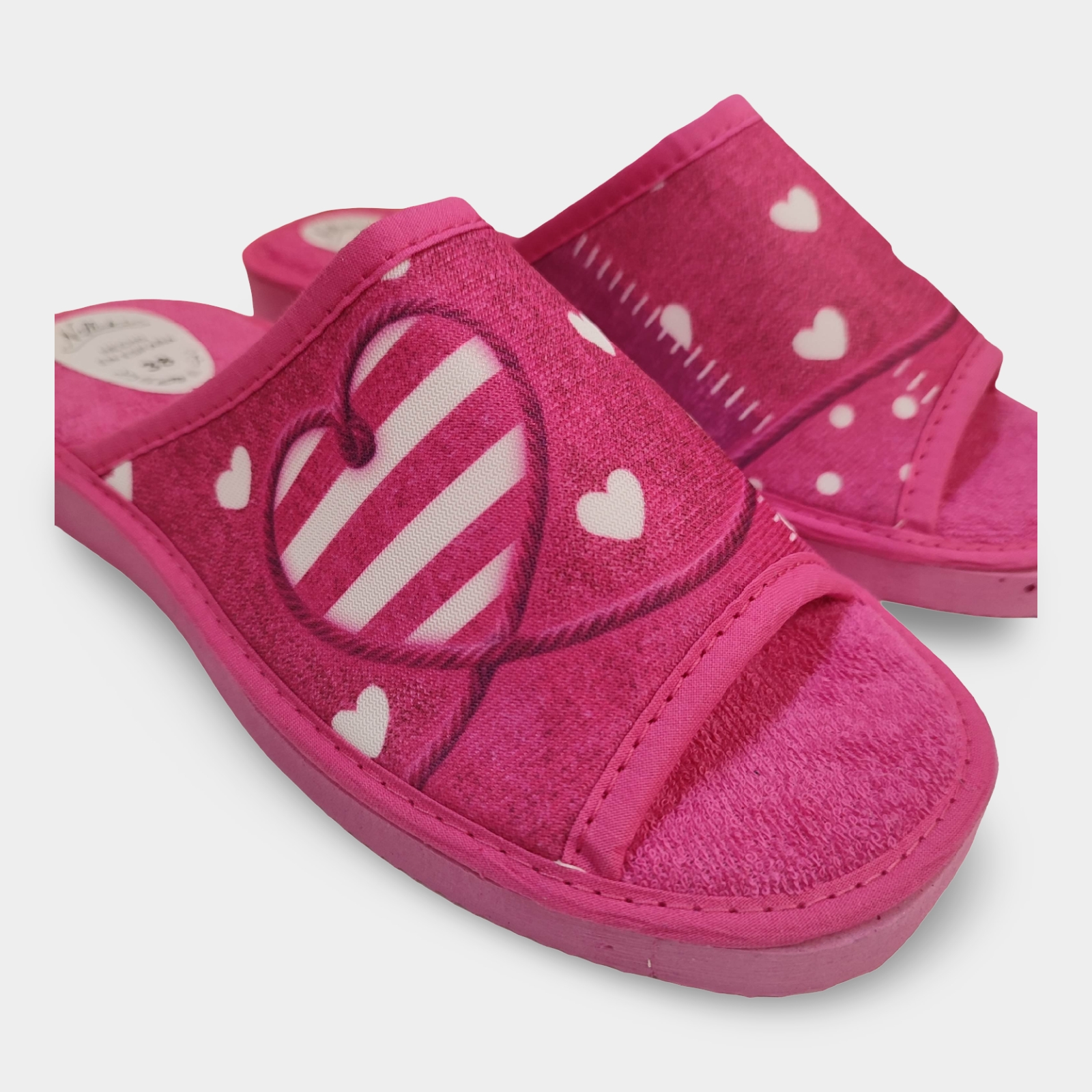 Pantufas femininas leves de tecido atoalhado rosa com estampa de coração.